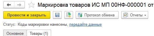 8) При успешном вводе в оборот в документе «Маркировка товаров» будет установлен статус «Коды маркировки введены в оборот»: