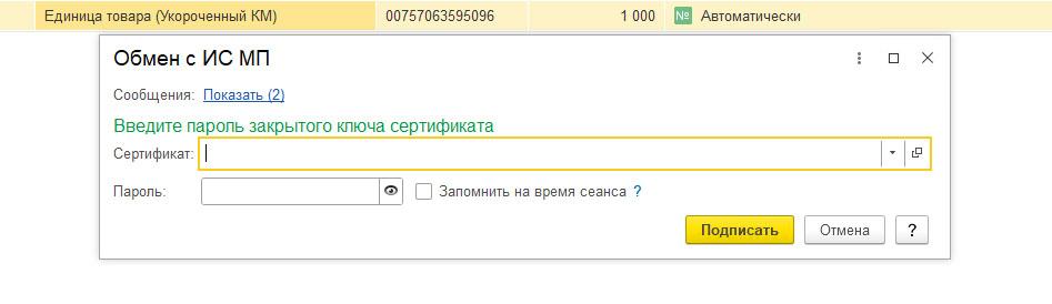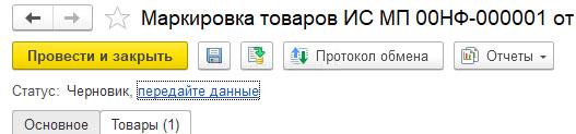 7) При успешном обмене статус документа измениться на «Коды маркировки нанесены, дальше необходимо ввести в оборот, для этого еще раз нажимаем «передайте данные», может еще раз потребоваться подписать документ электронной подписью: