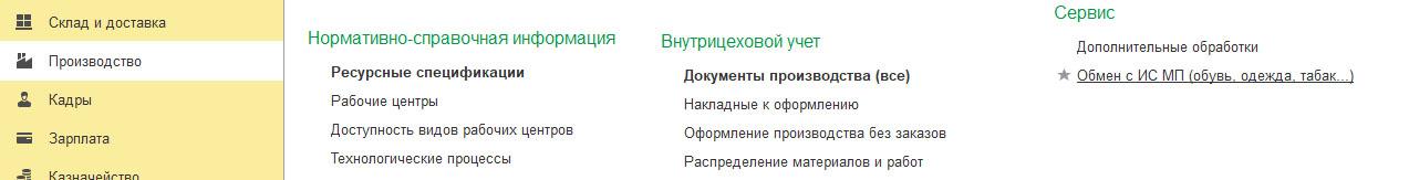 1) Заходим в панель обмена, для этого выбираем «Производство» и в группе «Сервис» нажимаем на «Обмен с ИСМП (обувь, одежда, табак…)»: