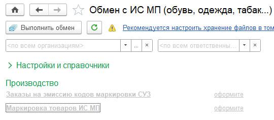 2) Далее в панели обмена выбираем пункт «Маркировка товаров ИС МП»:
