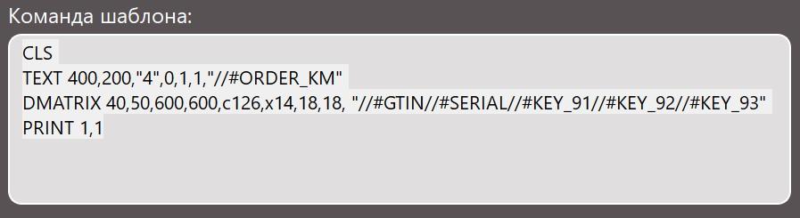 TEXT 400,200,"4",0,1,1,"//#ORDER_KM" - формирует текстовое поле с порядковым номером кода маркировки.